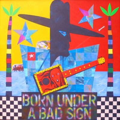 His work features vibrant juxtaposition of colour and is mainly mixed media, with a strong theme of performance/theatre running.