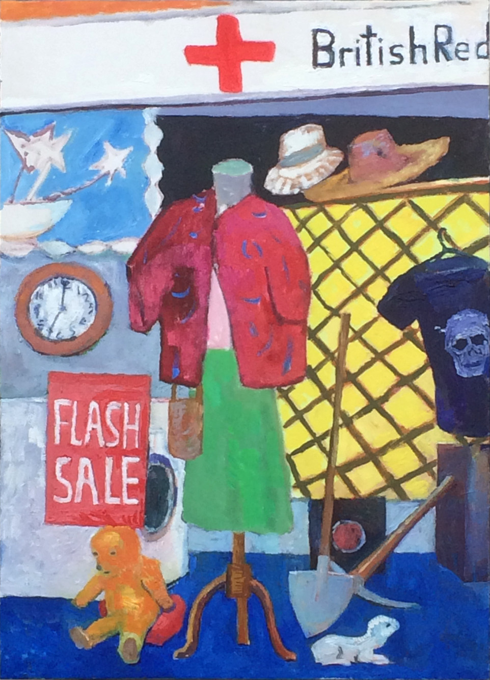 Charity shop windows are the equivalent of the cabinet of curiosities that Renaissance princes put together in order to entertain their guests. From a purely visual point of view they are an encyclopedia of different shapes, patterns and colours where any combination is possible. Where else could you put a wheelbarrow, a rocking horse and a wedding dress together in a picture?